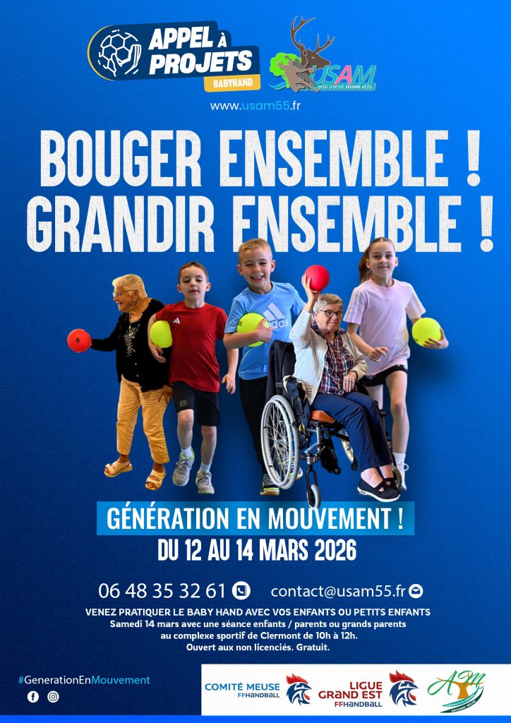 Pour conclure l’opération « Bouger Ensemble ! Grandir Ensemble ! » Venez pratiquer le baby hand avec vos enfants ou petits enfants (2020/2021/2022/2023) ce samedi 14 mars au complexe sportif de Clermont de 10h à 12h ! C’est ouvert aux non licenciés et c’est gratuit !